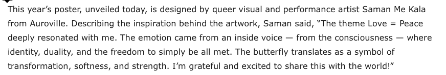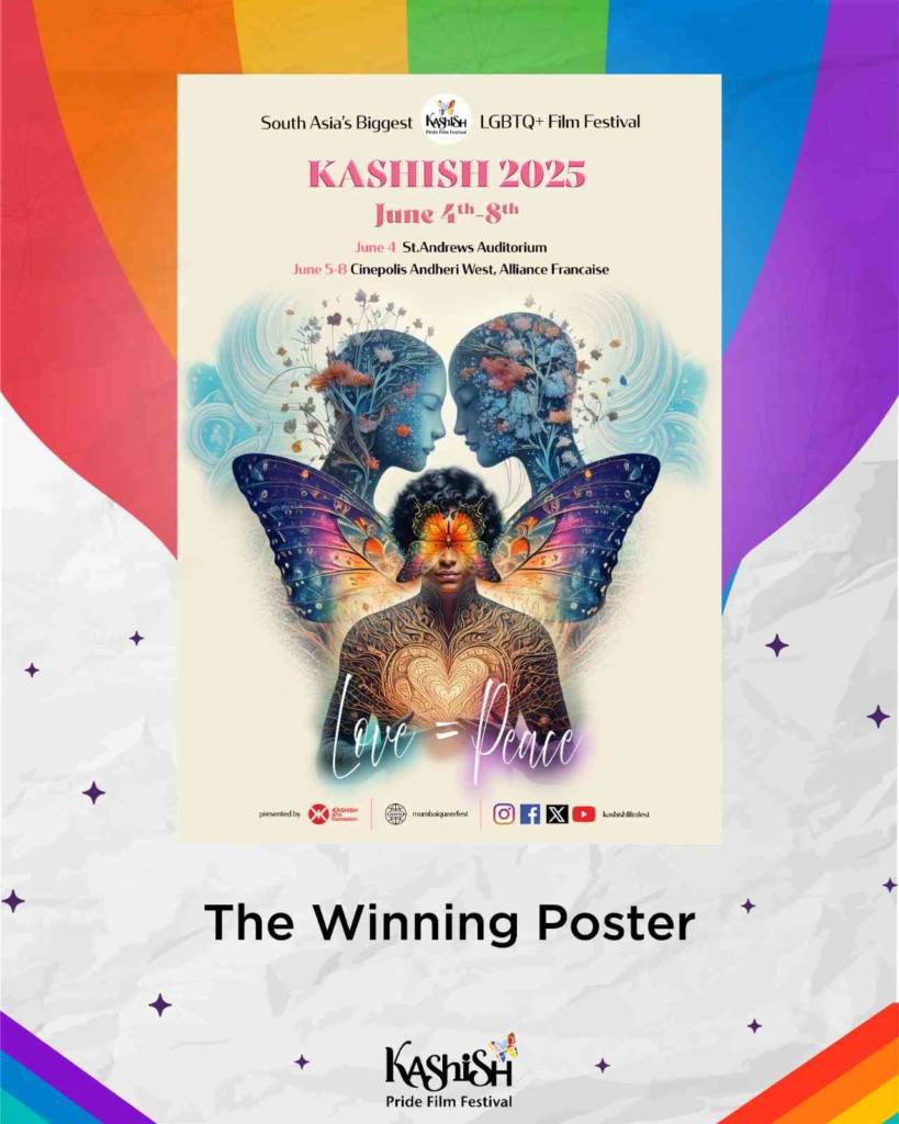 “Auroville-based designer Saman Me Kala has won the KASHISH 2025 International Poster Design Contest, setting the tone for South Asia’s biggest LGBTQIA+ film festival. KASHISH Pride Film Festival 2025, scheduled from June 4-8 in Mumbai, promises a vibrant celebration of queer cinema, creativity, and culture. As the festival expands to new venues and embraces the theme “Love = Peace,” audiences can look forward to powerful storytelling, inspiring artistry, and an inclusive space for LGBTQIA+ voices from India and around the world.“